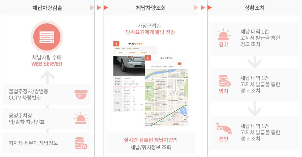 체납차량 영치시스템은 불법주정차 단속, 방범용 CCTV에서 촬영된 차량번호와